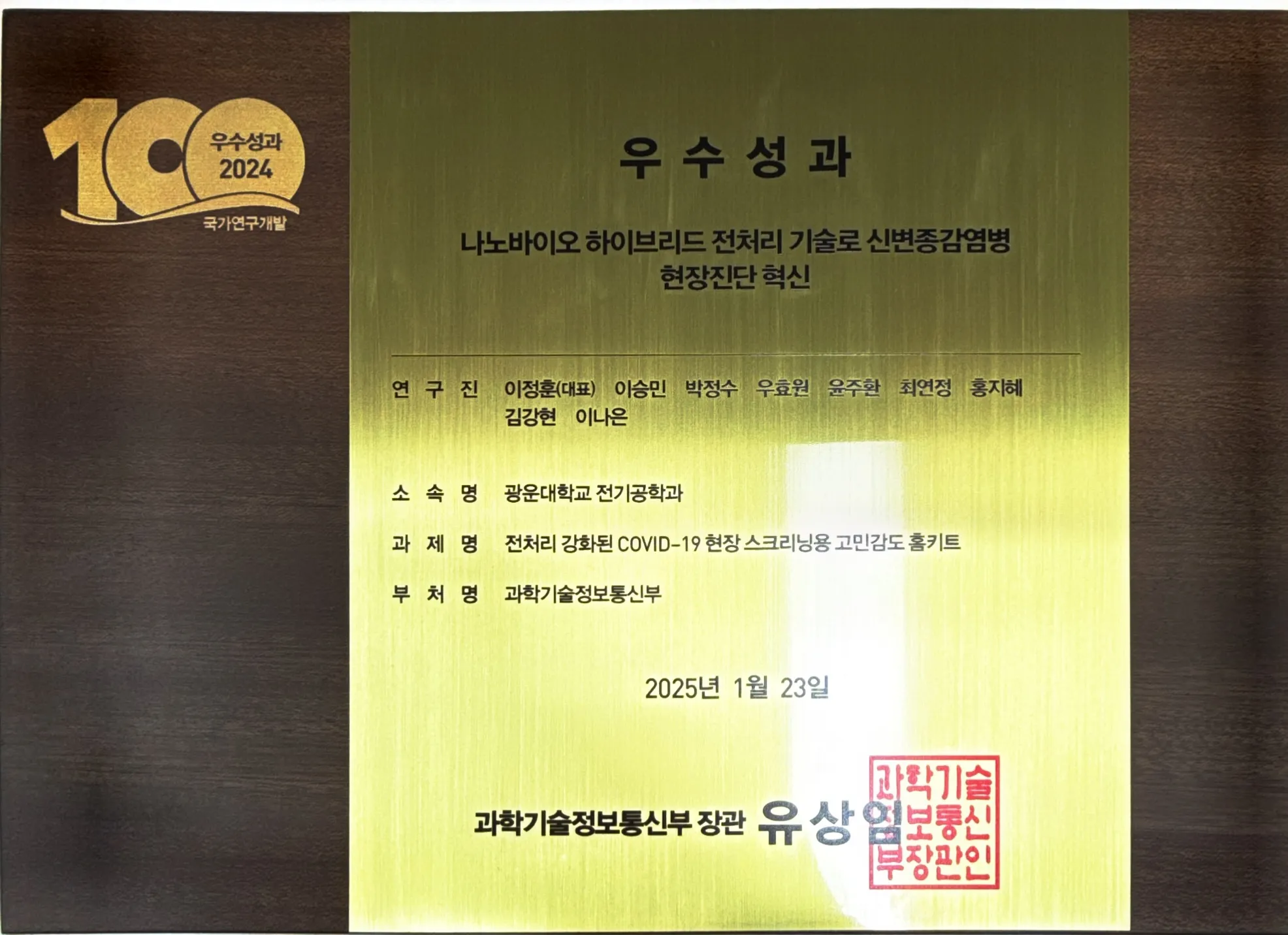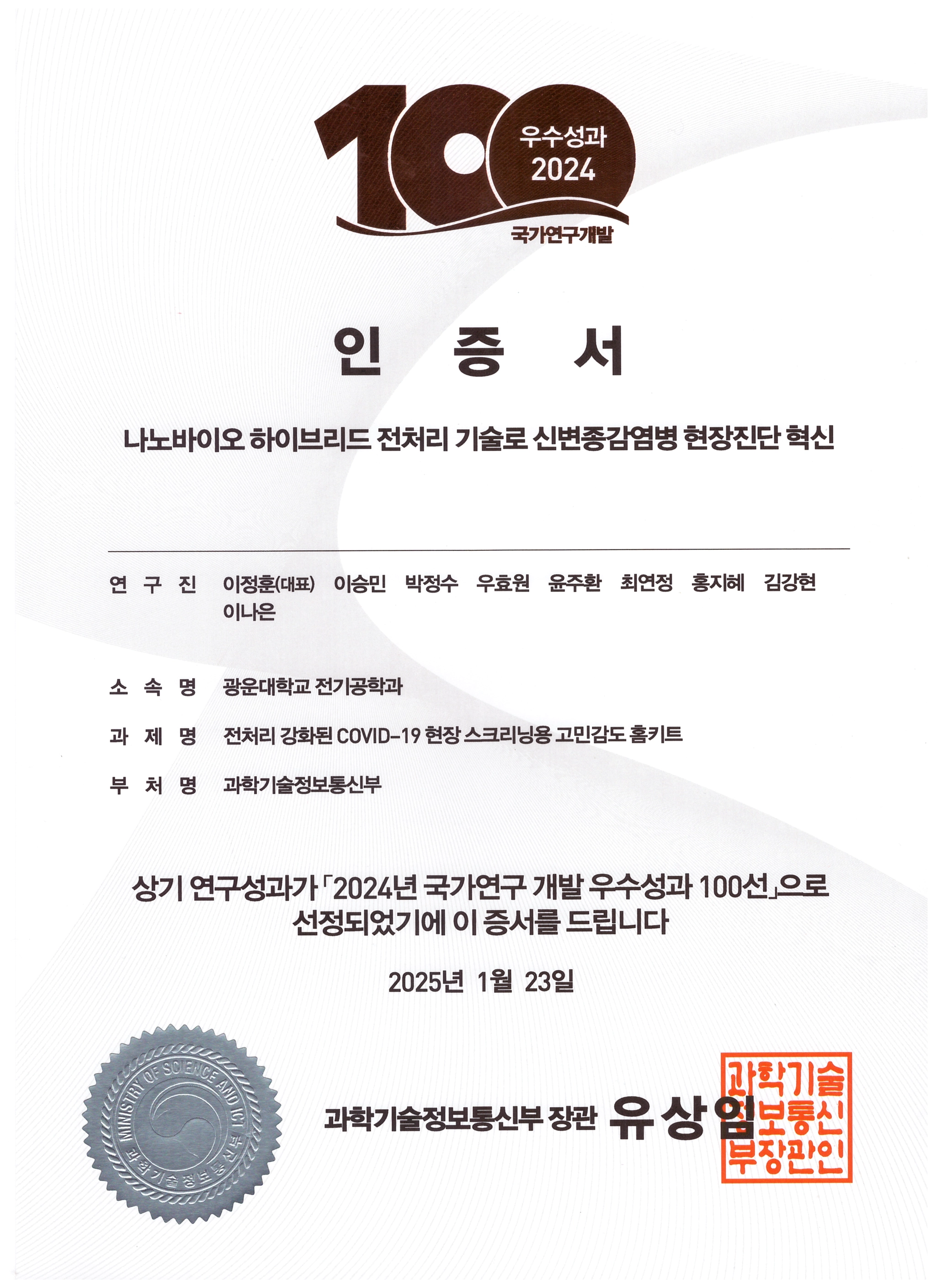 Our paper and technology transfer achievements for 'Sample-to-answer Platform for the Clinical Evaluation of COVID-19 using a Deep Learning-assisted Smartphone-based Assay,' Nature Communications (2023) 14: 2361, have been selected as one of the top 100 national R&D achievements in South Korea for 2024!