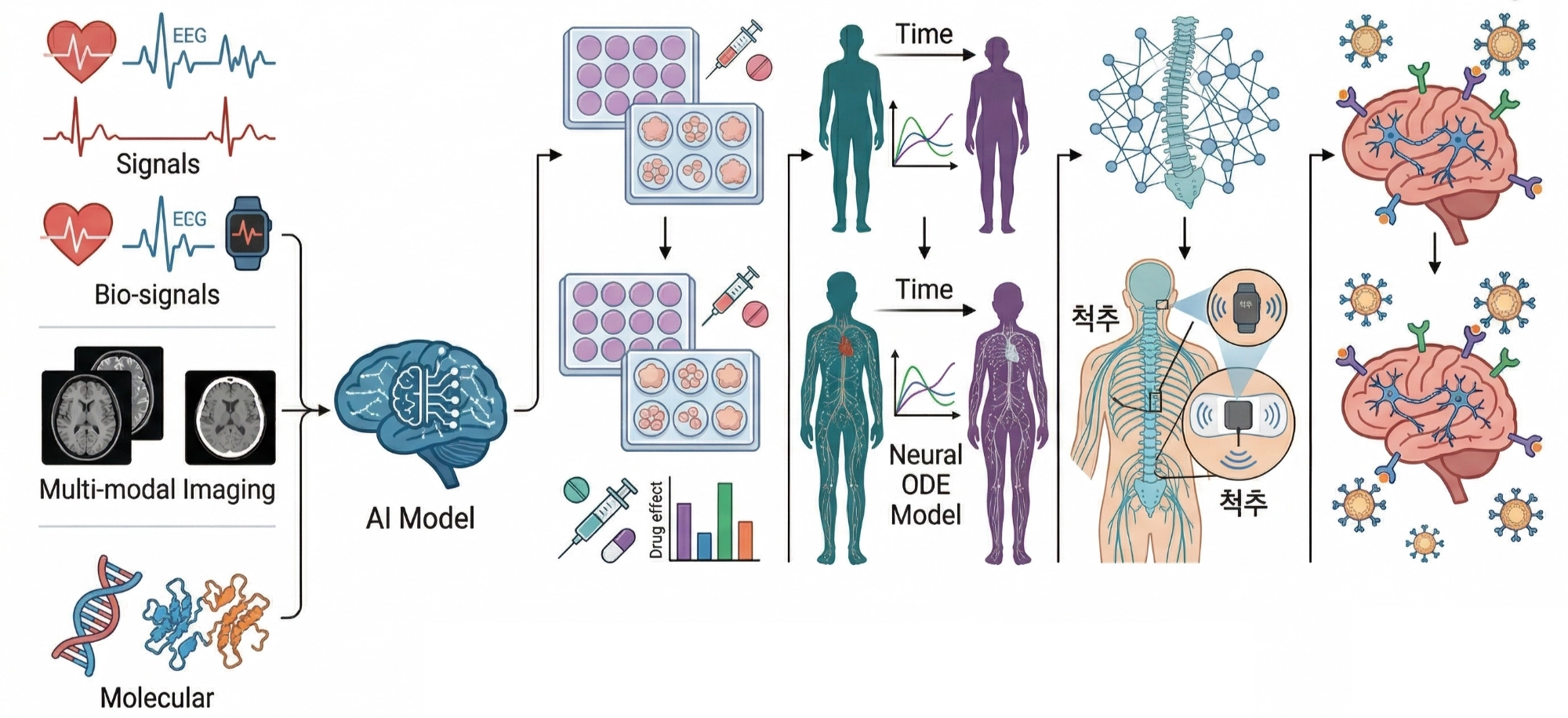 Deeply analyzing physiological states of the human body based on bio-signals, multi-modal imaging, and molecular-level data. Applications include organoid-based drug response prediction, Digital Aging Twin modeling via Neural ODE, electroceutical AI for chronic pain management, and biomimetic nanocomplexes for neurodegenerative disease monitoring.