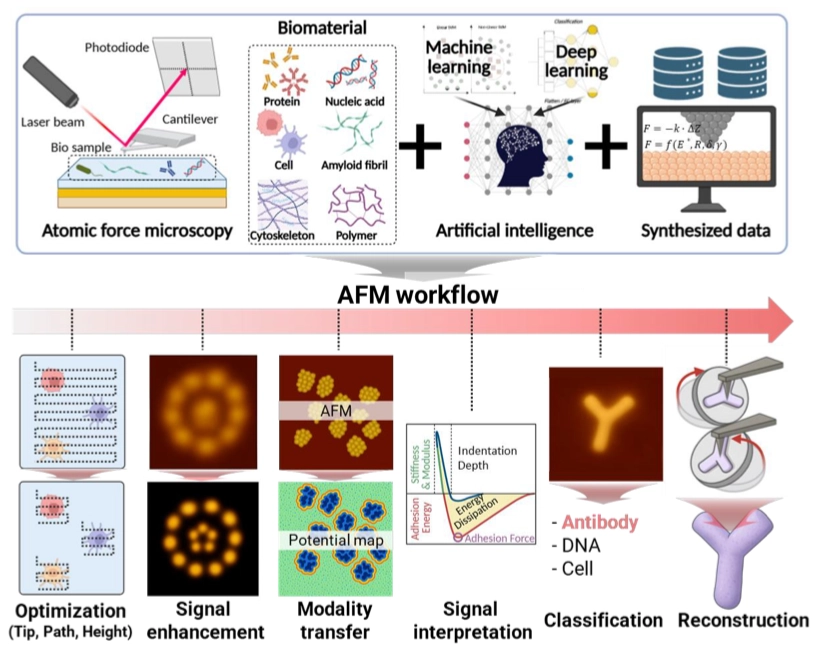 Combining deep learning with massive, complex signals from advanced physical and optical equipment. Raman-GPT autonomously controls Raman spectroscopy via multi-agent AI; PD-DLSU upscales portable Raman spectra to benchtop quality; AFM-AI automates nanoscale surface characterization and material property analysis.
