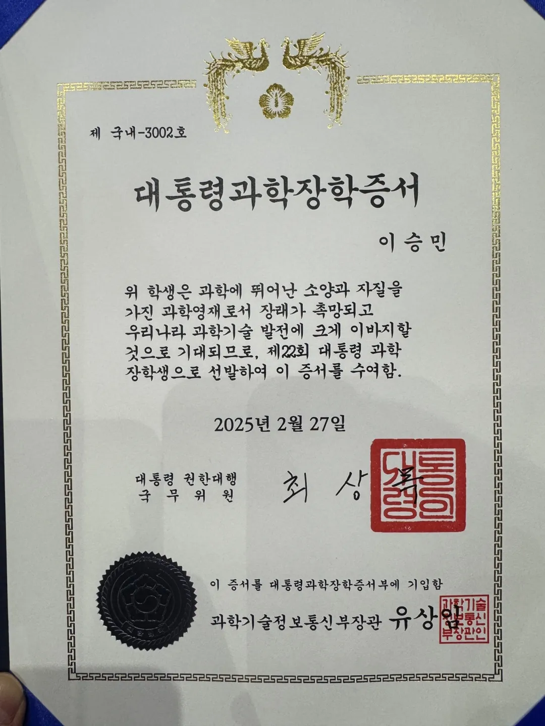 이승민 학생이 대통령 장학생으로 선정되었습니다! 축하합니다!