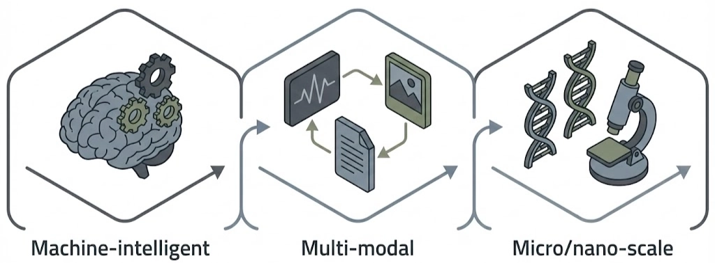 We redefine the 'm' in our name to represent a holistic approach: utilizing Machine-intelligent systems, integrating diverse Multi-modal datasets, and probing biological realities at the Micro/nano-scale.