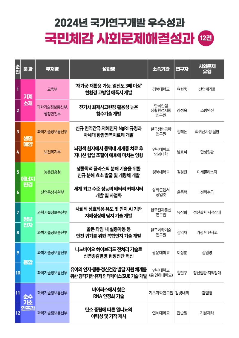2025/01 It was selected as the Ministry of Science and ICT Minister's Awards and recognized as one of the Top 12 Achievements in Solving Social Issues among the Top 100 Outstanding National R&D Achievements of 2024.